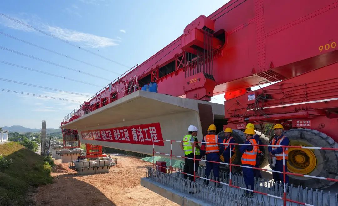 此次架设的箱梁为预制箱梁,出自深汕高铁SSSG-1标鹅埠制梁场。该制梁场承担着深汕高铁SSSG-1标331榀和SSSG-2标79榀,共计410榀箱梁的预制和架设任务。目前制梁场已预制箱梁36榀,预计将于2026年7月完成所有箱梁的预制和架设任务。