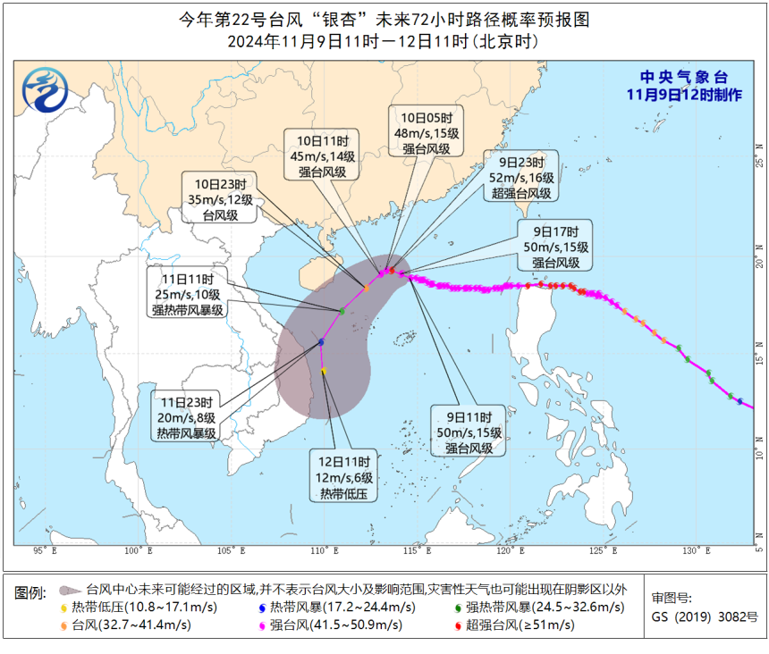 深圳市气象台11月9日11时00分在深汕海域、深汕特别合作区发布台风白色预警信号,台风“银杏”(强台风级)已进入深汕500公里防御圈,预计未来以偏西移动为主,趋向海南以东附近海域。