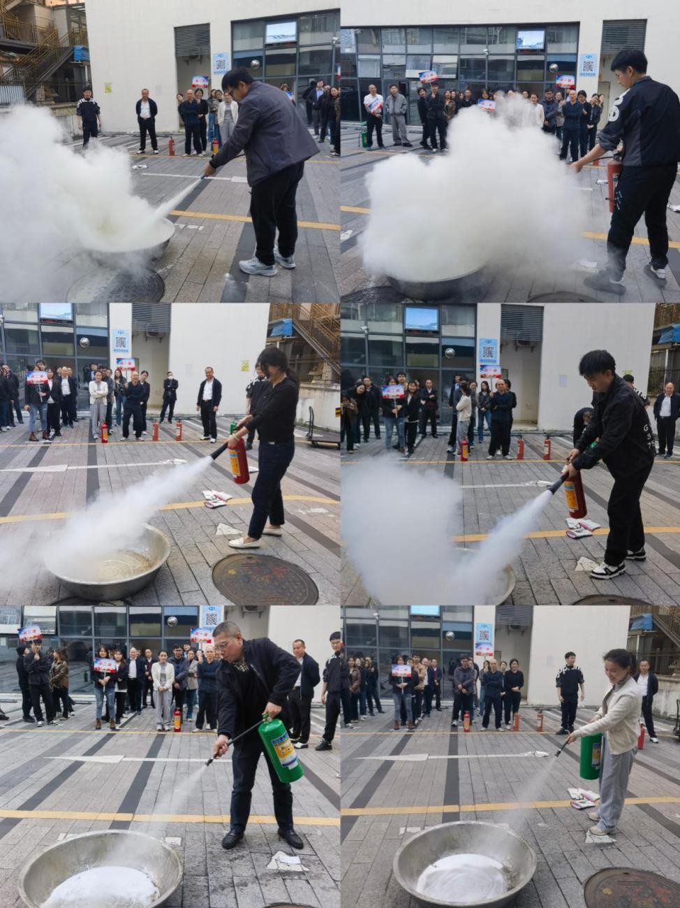 随后进入消防设备设施实操活动,经过理论培训,全体员工学会了灭火器的操作方式,包括拔掉安全插销、握紧喷管、按下压把和对准火源根部等关键动作。全体员工分成四组,分别实操了干粉灭火器、二氧化碳灭火器和水基型灭火器,亲身体验了灭火器扑灭初期火灾的过程,通过以身入局、理论结合实际的方式增强了自身的安全意识和自救互救能力。