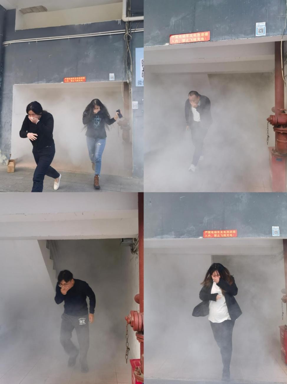 会后,进入应急疏散演练,通过现场投放烟雾弹模拟火灾突发事故的真实场景,待到烟雾扩散时,现场人员敲响消防警铃,面对突如其来的“火灾”,办公楼全体人员立刻顶着浓烟捂着鼻、弯着腰、低着身,沿着预定路线快速有序地从消防通道撤离灾害现场,到达安全地点后,工作人员迅速清点人数,确保疏散人员无一人遗漏。整个疏散演练过程严肃、紧张,做到了“冷静、快速、有秩序”,取得了预期的效果。