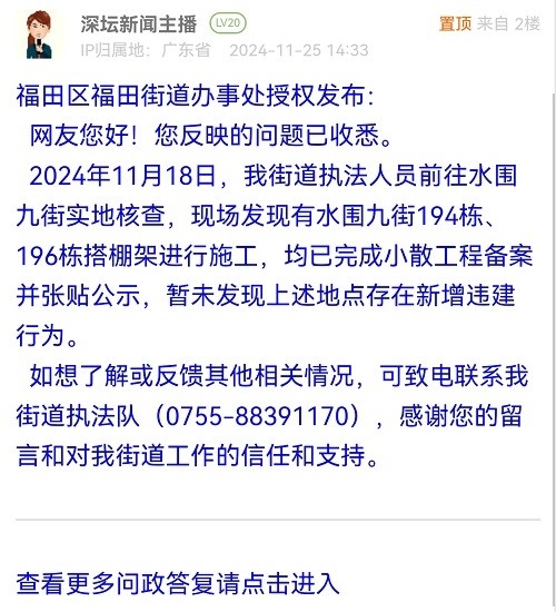 网友您好!您反映的问题已收悉。2024年11月18日,我街道执法人员前往水围九街实地核查,现场发现有水围九街194栋、196栋搭棚架进行施工,均已完成小散工程备案并张贴公示,暂未发现上述地点存在新增违建行为。如想了解或反馈其他相关情况,可致电联系我街道执法队(0755-88391170),感谢您的留言和对我街道工作的信任和支持。