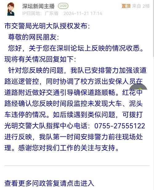 尊敬的网民朋友:您好,关于您在深圳论坛上反映的情况收悉。现将有关情况回复如下:针对您反映的问题,我队已安排警力加强该道路巡逻管控,同时协调了校方派出安保人员在道路附近做好交通引导确保道路顺畅。红花中路经确认您反映时间段监控未发现大车、泥头车违停的情况。如后续遇到类似问题,可拨打光明交警大队指挥中心电话:0755-27555122进行反映,我队第一时间安排警力前往现场处理。感谢您对我们工作的关注与支持。