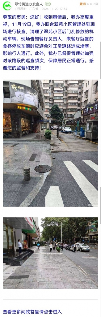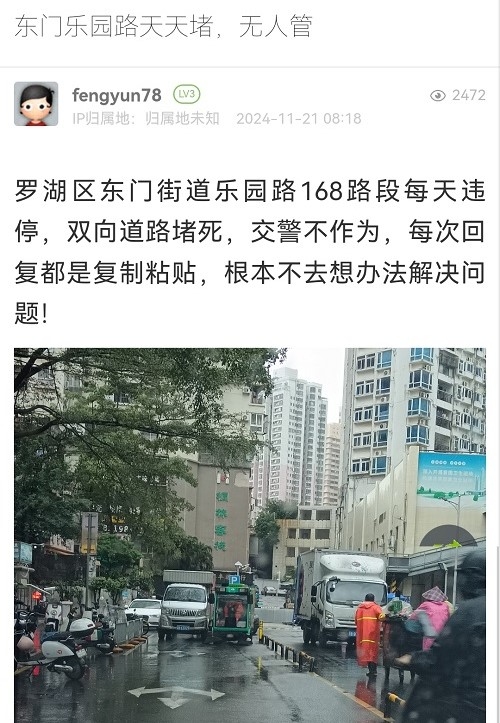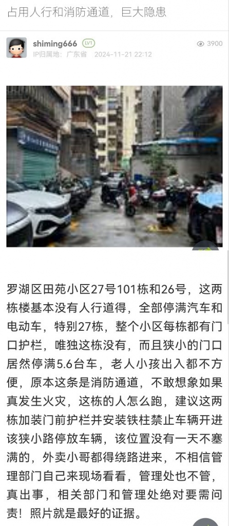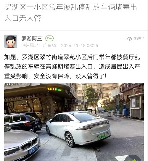 1. 帖文《罗湖区一小区常年被乱停乱放车辆堵塞出入口无人管》