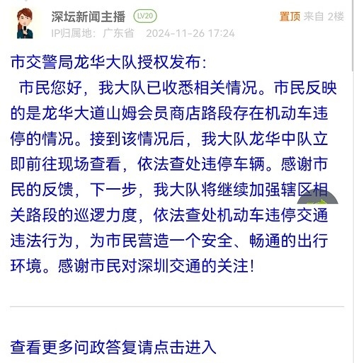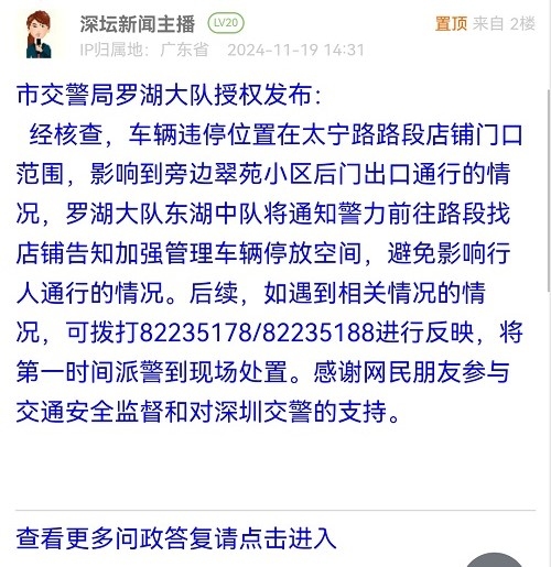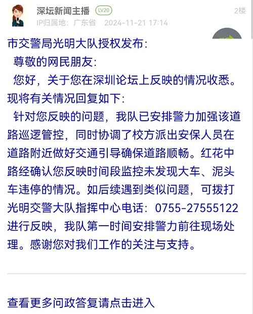 各职能单位如需对网友反映的问题进行回应,可在深圳论坛注册官方账号并通过认证,回帖进行回应。
