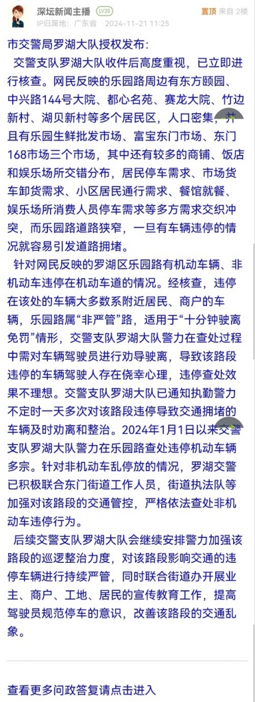 交警支队罗湖大队收件后高度重视,已立即进行核查。网民反映的乐园路周边有东方颐园、中兴路144号大院、都心名苑、赛龙大院、竹边新村、湖贝新村等多个居民区,人口密集,并且有乐园生鲜批发市场、富宝东门市场、东门168市场三个市场,其中还有较多的商铺、饭店和娱乐场所交错分布,居民停车需求、市场货车卸货需求、小区居民通行需求、餐馆就餐、娱乐场所消费人员停车需求等多方需求交织冲突,而乐园路道路狭窄,一旦有车辆违停的情况就容易引发道路拥堵。
