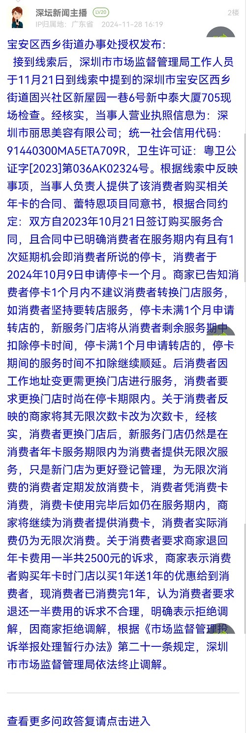 接到线索后,深圳市市场监督管理局工作人员于11月21日到线索中提到的深圳市宝安区西乡街道固兴社区新屋园一巷6号新中泰大厦705现场检查。经核实,当事人营业执照信息为:深圳市丽思美容有限公司;统一社会信用代码:91440300MA5ETA709R,卫生许可证:粤卫公证字[2023]第036AK02324号。根据线索中反映事项,当事人负责人提供了该消费者购买相关年卡的合同、蕾特恩项目同意书,根据合同约定:双方自2023年10月21日签订购买服务合同,且合同中已明确消费者在服务期内有且有1次延期机会即消费者所说的停卡,消费者于2024年10月9日申请停卡一个月。商家已告知消费者停卡1个月内不建议消费者转换门店服务,如消费者坚持要转店服务,停卡未满1个月申请转店的,新服务门店将从消费者剩余服务期中扣除停卡时间,停卡满1个月申请转店的,停卡期间的服务时间不扣除继续顺延。后消费者因工作地址变更需更换门店进行服务,消费者要求更换门店时尚在停卡期限内。关于消费者反映的商家将其无限次数卡改为次数卡,经核实,消费者更换门店后,新服务门店仍然是在消费者年卡服务期限内为消费者提供无限次服务,只是新门店为更好登记管理,为无限次消费的消费者定期发放消费卡,消费者凭消费卡消费,消费卡使用完毕后如仍在服务期内,商家将继续为消费者提供消费卡,消费者实际消费仍为无限次消费。关于消费者要求商家退回年卡费用一半共2500元的诉求,商家表示消费者购买年卡时门店以买1年送1年的优惠给到消费者,现消费者已消费完1年,认为消费者要求退还一半费用的诉求不合理,明确表示拒绝调解,因商家拒绝调解,根据《市场监督管理投诉举报处理暂行办法》第二十一条规定,深圳市市场监督管理局依法终止调解。