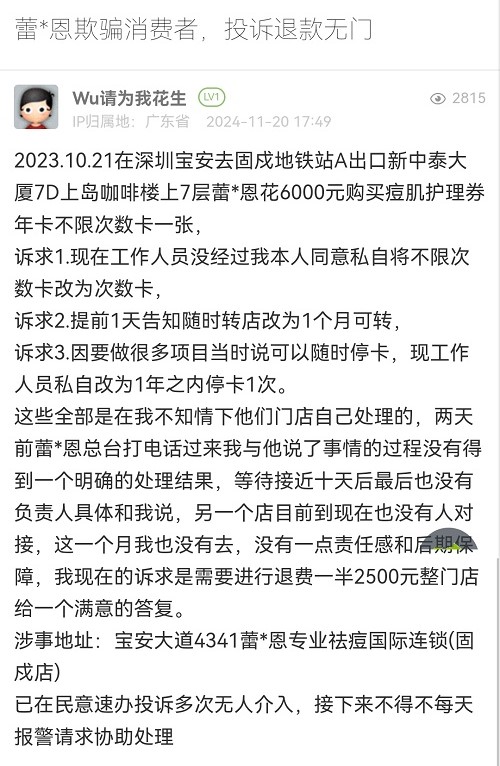 21. 帖文《蕾*恩欺骗消费者,投诉退款无门》