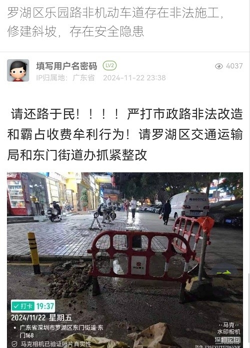 11. 帖文《罗湖区乐园路非机动车道存在非法施工,修建斜坡,存在安全隐患》