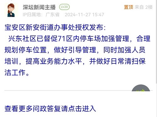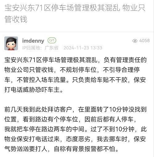 19. 帖文《宝安兴东71区停车场管理极其混乱 物业只管收钱》