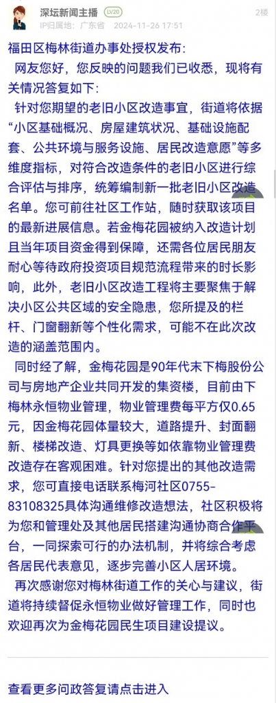 同时经了解,金梅花园是90年代末下梅股份公司与房地产企业共同开发的集资楼,目前由下梅林永恒物业管理,物业管理费每平方仅0.65元,因金梅花园体量较大,道路提升、封面翻新、楼梯改造、灯具更换等如依靠物业管理费改造存在客观困难。针对您提出的其他改造需求,您可直接电话联系梅河社区0755-83108325具体沟通维修改造想法,社区积极将为您和管理处及其他居民搭建沟通协商合作平台,一同探索可行的办法机制,并将综合考虑各居民代表意见,逐步完善小区人居环境。