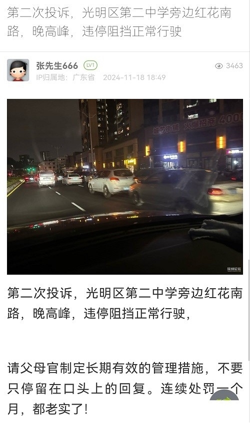 3. 帖文《第二次投诉,光明区第二中学旁边红花南路,晚高峰,违停阻挡正常行驶》