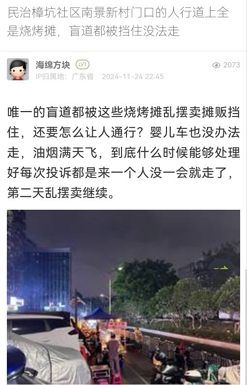 18. 帖文《民治樟坑社区南景新村门口的人行道上全是烧烤摊,盲道都被挡住没法走》