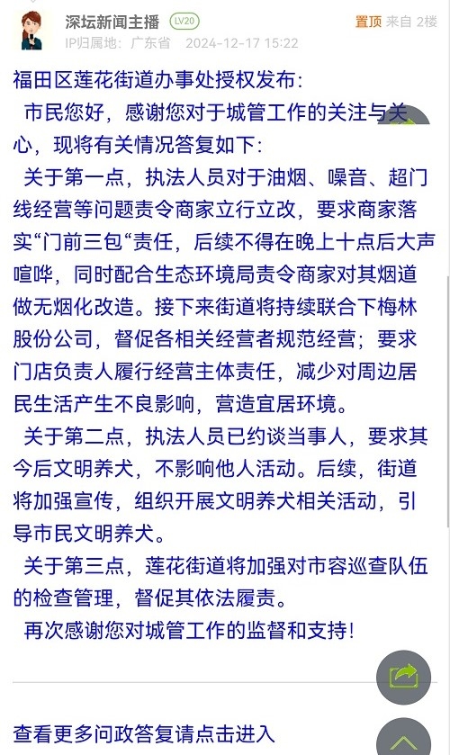 关于第一点,执法人员对于油烟、噪音、超门线经营等问题责令商家立行立改,要求商家落实“门前三包“责任,后续不得在晚上十点后大声喧哗,同时配合生态环境局责令商家对其烟道做无烟化改造。接下来街道将持续联合下梅林股份公司,督促各相关经营者规范经营;要求门店负责人履行经营主体责任,减少对周边居民生活产生不良影响,营造宜居环境。