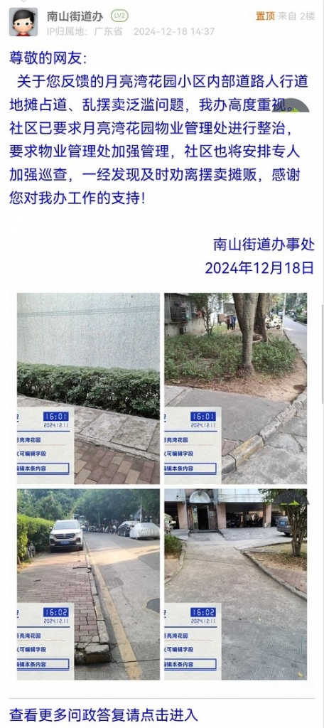 17. 帖文《投诉:南山区南山街道月亮湾花园小区【内部道路】人行道被占道摆摊 乱摆卖泛滥,无人管理》