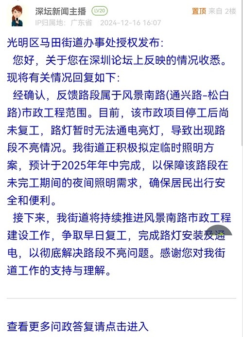 您好,关于您在深圳论坛上反映的情况收悉。现将有关情况回复如下:经确认,反馈路段属于风景南路(通兴路-松白路)市政工程范围。目前,该市政项目停工后尚未复工,路灯暂时无法通电亮灯,导致出现路段不亮情况。我街道正积极拟定临时照明方案,预计于2025年年中完成,以保障该路段在未完工期间的夜间照明需求,确保居民出行安全和便利。接下来,我街道将持续推进风景南路市政工程建设工作,争取早日复工,完成路灯安装及通电,以彻底解决路段不亮问题。感谢您对我街道工作的支持与理解。
