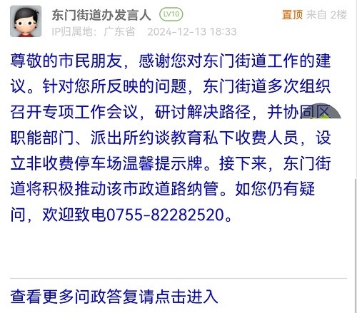 尊敬的市民朋友,感谢您对东门街道工作的建议。针对您所反映的问题,东门街道多次组织召开专项工作会议,研讨解决路径,并协同区职能部门、派出所约谈教育私下收费人员,设立非收费停车场温馨提示牌。接下来,东门街道将积极推动该市政道路纳管。如您仍有疑问,欢迎致电0755-82282520。