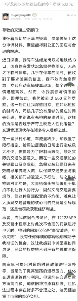 5. 帖文《申诉龙岗双龙地铁站临时停车罚款 500 元》