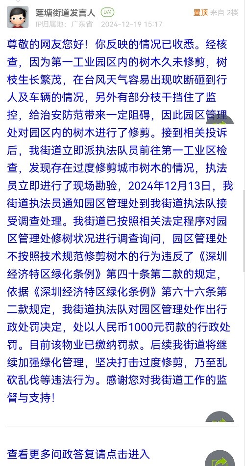 尊敬的网友您好!你反映的情况已收悉。经核查,因为第一工业园区内的树木久未修剪,树枝生长繁茂,在台风天气容易出现吹断砸到行人及车辆的情况,另外有部分枝干挡住了监控,给治安防范带来一定阻碍,因此园区管理处对园区内的树木进行了修剪。接到相关投诉后,我街道立即派执法队员前往第一工业区检查,发现存在过度修剪城市树木的情况,执法员立即进行了现场勘验,2024年12月13日,我街道执法员通知园区管理处到我街道执法队接受调查处理。我街道已按照相关法定程序对园区管理处修树状况进行调查询问,园区管理处不按照技术规范修剪树木的行为违反了《深圳经济特区绿化条例》第四十条第二款的规定,依据《深圳经济特区绿化条例》第六十六条第二款规定,我街道执法队对园区管理处作出行政处罚决定,处以人民币1000元罚款的行政处罚。目前该物业已缴纳罚款。后续我街道将继续加强绿化管理,坚决打击过度修剪,乃至乱砍乱伐等违法行为。感谢您对我街道工作的监督与支持!