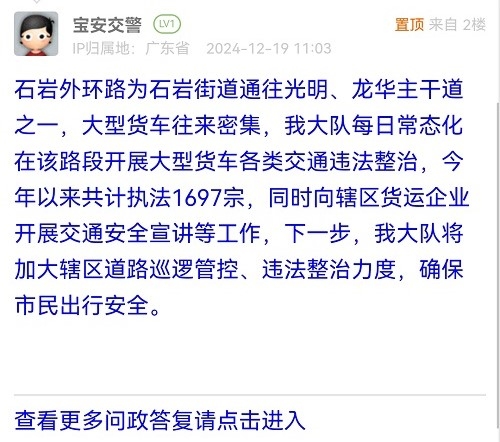 石岩外环路为石岩街道通往光明、龙华主干道之一,大型货车往来密集,我大队每日常态化在该路段开展大型货车各类交通违法整治,今年以来共计执法1697宗,同时向辖区货运企业开展交通安全宣讲等工作,下一步,我大队将加大辖区道路巡逻管控、违法整治力度,确保市民出行安全。