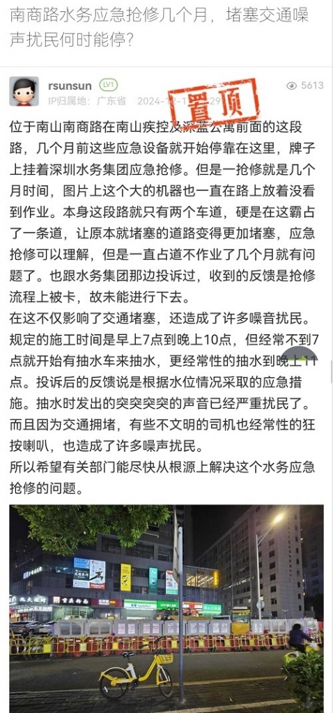 18. 帖文《南商路水务应急抢修几个月,堵塞交通噪声扰民何时能停?》