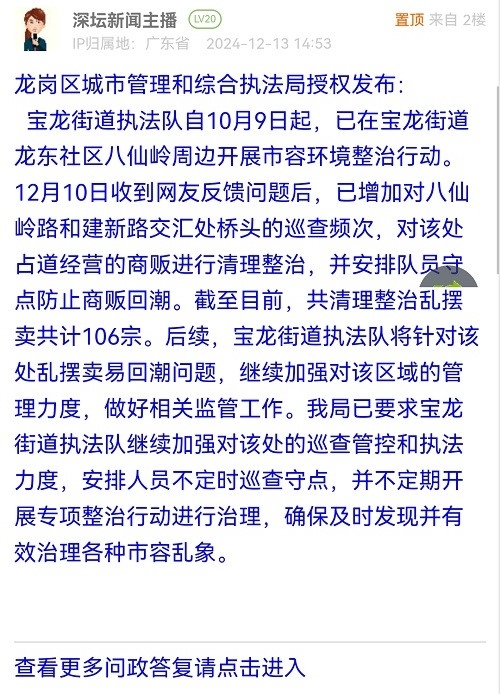 宝龙街道执法队自10月9日起,已在宝龙街道龙东社区八仙岭周边开展市容环境整治行动。12月10日收到网友反馈问题后,已增加对八仙岭路和建新路交汇处桥头的巡查频次,对该处占道经营的商贩进行清理整治,并安排队员守点防止商贩回潮。截至目前,共清理整治乱摆卖共计106宗。后续,宝龙街道执法队将针对该处乱摆卖易回潮问题,继续加强对该区域的管理力度,做好相关监管工作。我局已要求宝龙街道执法队继续加强对该处的巡查管控和执法力度,安排人员不定时巡查守点,并不定期开展专项整治行动进行治理,确保及时发现并有效治理各种市容乱象。