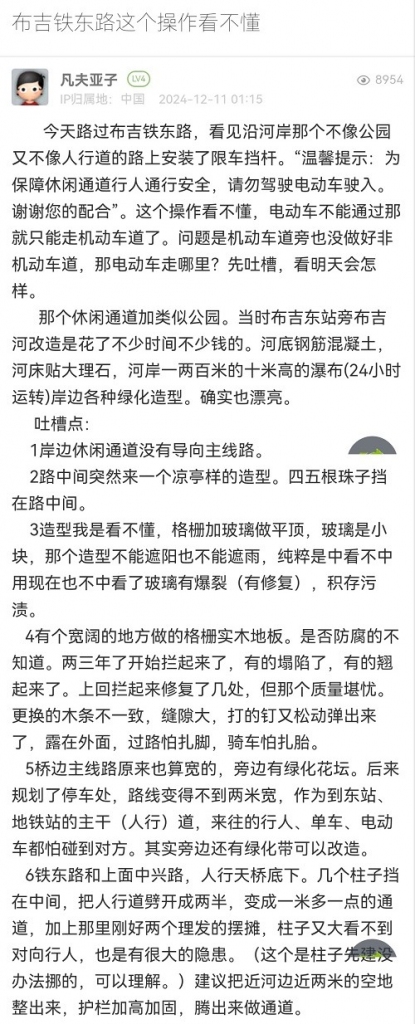 二、关于岸边休闲通道没有导向主线路问题。布吉河城市客厅段属于布吉河综合整治工程的一项内容,原设计考虑为市民休闲步道,可实现与金运路人车分离,但由于该休闲步道为河岸零星地块改造而来,步道宽度难以满足电单车和行人同时通行。