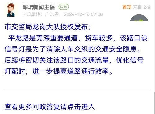 平龙路是莞深重要通道,货车较多,该路口设信号灯是为了消除人车交织的交通安全隐患。后续将密切关注该路口的交通流量,优化信号灯配时,进一步提高道路通行效率。