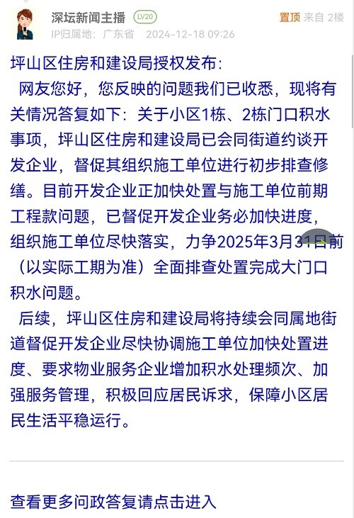 网友您好,您反映的问题我们已收悉,现将有关情况答复如下:关于小区1栋、2栋门口积水事项,坪山区住房和建设局已会同街道约谈开发企业,督促其组织施工单位进行初步排查修缮。目前开发企业正加快处置与施工单位前期工程款问题,已督促开发企业务必加快进度,组织施工单位尽快落实,力争2025年3月31日前(以实际工期为准)全面排查处置完成大门口积水问题。后续,坪山区住房和建设局将持续会同属地街道督促开发企业尽快协调施工单位加快处置进度、要求物业服务企业增加积水处理频次、加强服务管理,积极回应居民诉求,保障小区居民生活平稳运行。