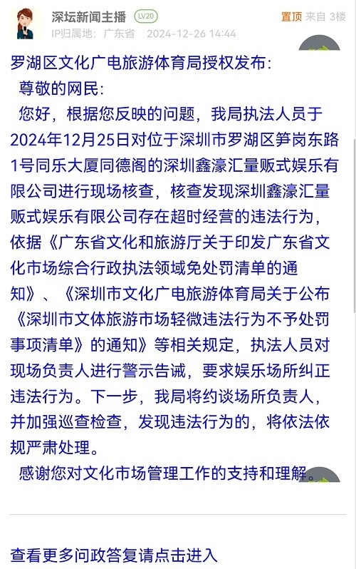 尊敬的网民:您好,根据您反映的问题,我局执法人员于2024年12月25日对位于深圳市罗湖区笋岗东路1号同乐大厦同德阁的深圳鑫濠汇量贩式娱乐有限公司进行现场核查,核查发现深圳鑫濠汇量贩式娱乐有限公司存在超时经营的违法行为,依据《广东省文化和旅游厅关于印发广东省文化市场综合行政执法领域免处罚清单的通知》、《深圳市文化广电旅游体育局关于公布《深圳市文体旅游市场轻微违法行为不予处罚事项清单》的通知》等相关规定,执法人员对现场负责人进行警示告诫,要求娱乐场所纠正违法行为。下一步,我局将约谈场所负责人,并加强巡查检查,发现违法行为的,将依法依规严肃处理。感谢您对文化市场管理工作的支持和理解。