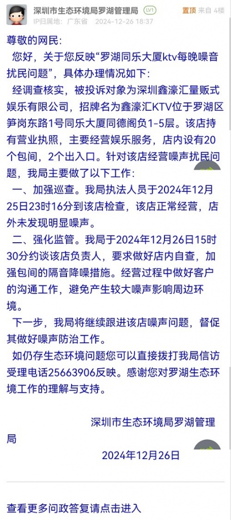 尊敬的网民:您好,关于您反映“罗湖同乐大厦ktv每晚噪音扰民问题”,具体办理情况如下: