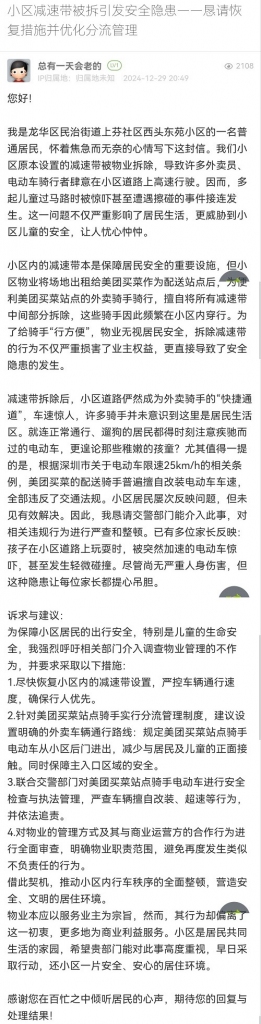 21. 帖文《小区减速带被拆引发安全隐患——恳请恢复措施并优化分流管理》