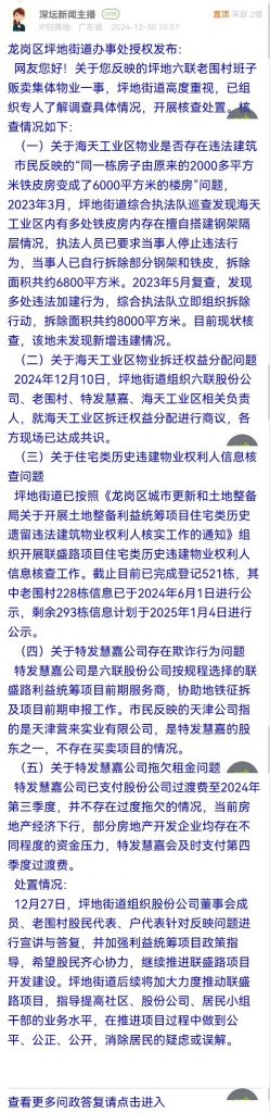 12月27日,坪地街道组织股份公司董事会成员、老围村股民代表、户代表针对反映问题进行宣讲与答复,并加强利益统筹项目政策指导,希望股民齐心协力,继续推进联盛路项目开发建设。坪地街道后续将加大力度推动联盛路项目,指导提高社区、股份公司、居民小组干部的业务水平,在推进项目过程中做到公平、公正、公开,消除居民的疑虑或误解。