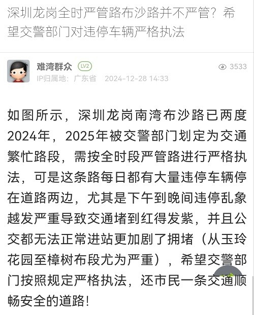 16. 帖文《深圳龙岗全时严管路布沙路并不严管?希望交警部门对违停车辆严格执法》