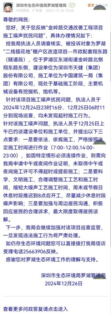 针对该项目施工噪声扰民问题,执法人员于2024年12月24日23时16分、12月25日06时11分到现场巡查,均未发现超时施工行为。