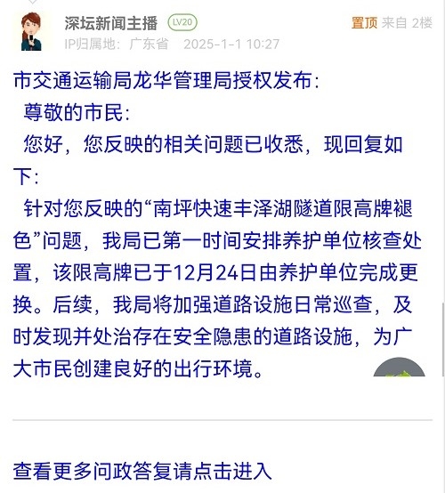 20. 帖文《关于南坪快速丰泽湖隧道交通标志牌更新问题的诉求与建议》