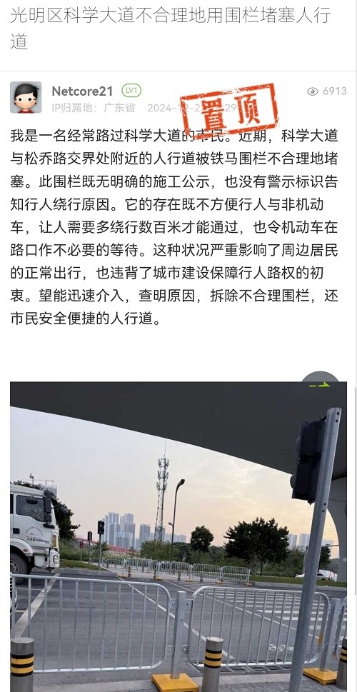 6. 帖文《光明区科学大道不合理地用围栏堵塞人行道》