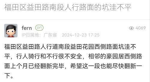 5. 帖文《福田区益田路南段人行路面的坑洼不平》