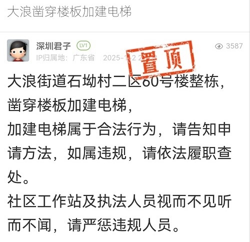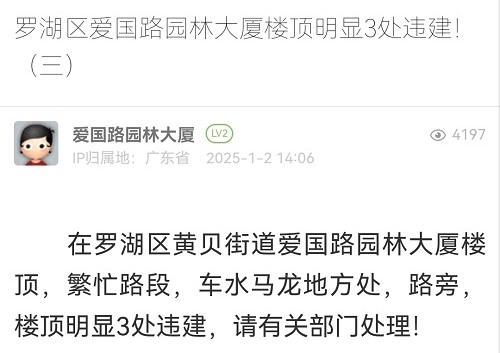 16. 帖文《罗湖区爱国路园林大厦楼顶明显3处违建!(三)》