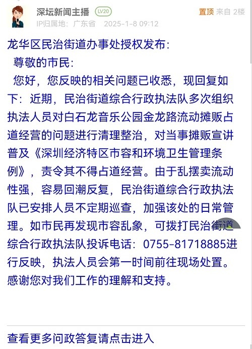 您好,您反映的相关问题已收悉,现回复如下:近期,民治街道综合行政执法队多次组织执法人员对白石龙音乐公园金龙路流动摊贩占道经营的问题进行清理整治,对当事摊贩宣讲普及《深圳经济特区市容和环境卫生管理条例》,责令其不得占道经营。由于乱摆卖流动性强,容易回潮反复,民治街道综合行政执法队已安排人员不定期巡查,加强该处的日常管理。如市民再发现市容乱象,可拨打民治街道综合行政执法队投诉电话:0755-81718885进行反映,执法人员会第一时间前往现场处置。感谢您对我们工作的理解和支持。