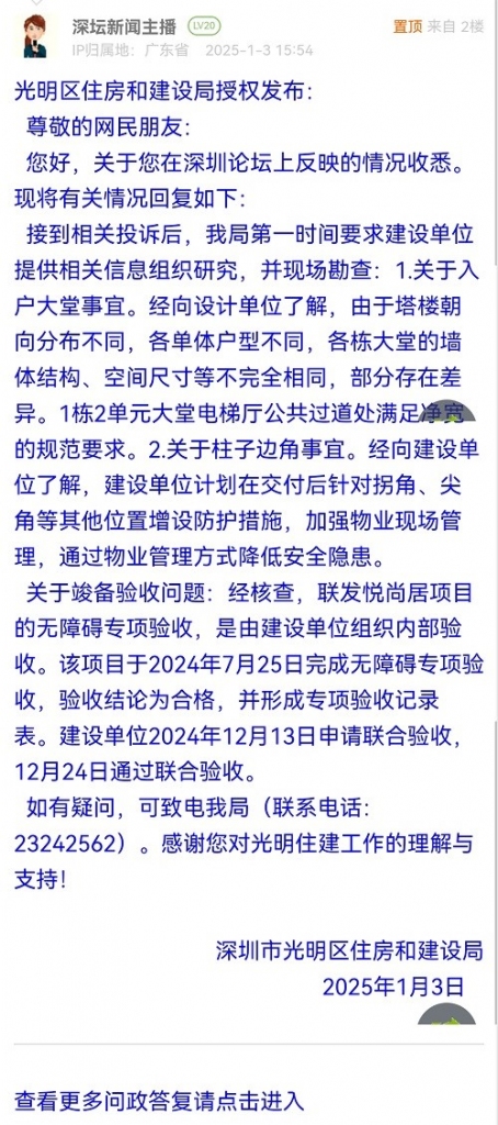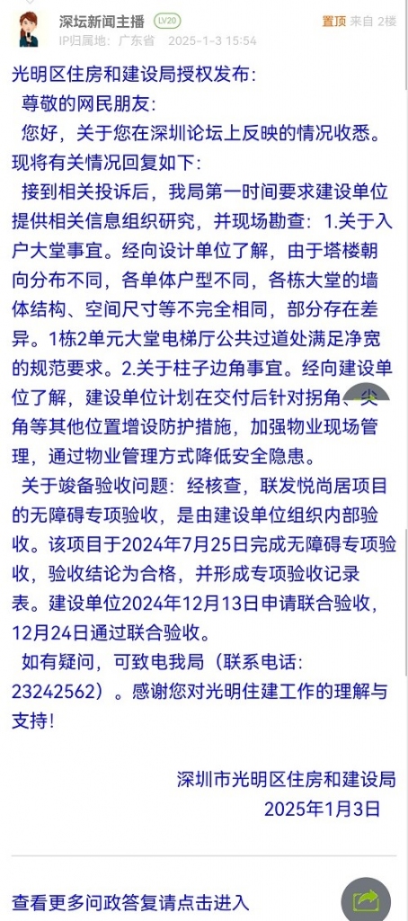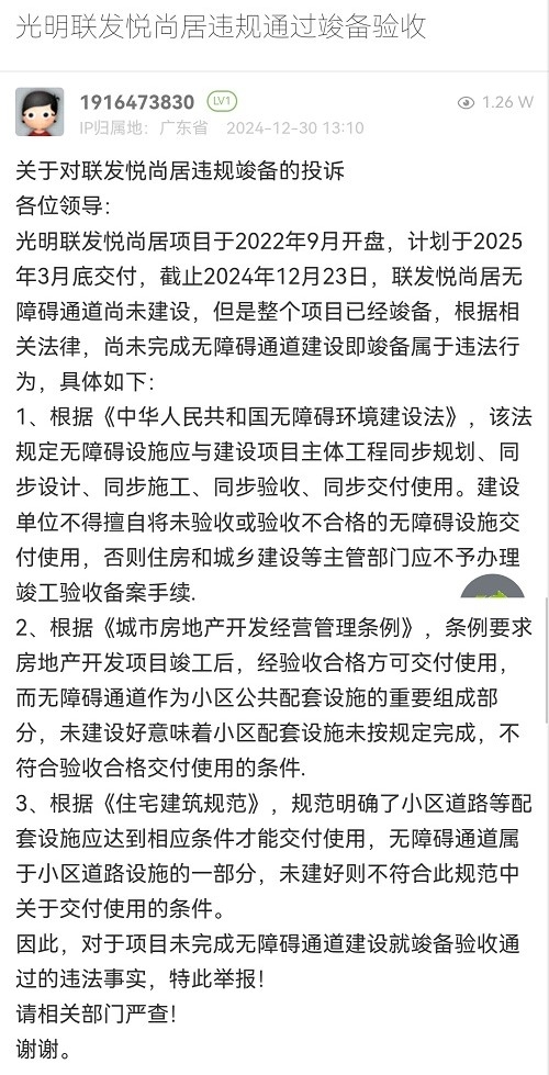 4. 帖文《光明联发悦尚居违规通过竣备验收》