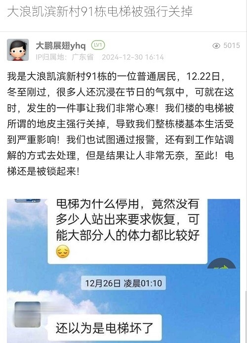 7. 帖文《大浪凯滨新村91栋电梯被强行关掉》