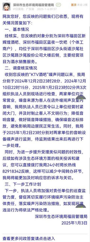 收到您反映的“KTV酒吧”噪声问题以来,我局分别于2024年12月2日23时28分、2024年12月10日22时15分、2025年1月2日23时02分共3次组织执法人员到现场进行检查,两家单位均正常营业,噪音来源为客人在店外喧闹声及室内音响,我局执法人员已责令以上单位经营时紧闭大门,并及时制止客人不文明行为;降低音响音量,做好隔音降噪措施,确保噪音达标排放,避免影响周边居民正常生活。同时,我局于2025年1月2日23时分别对两家单位的音响设备噪声进行监测,待监测结果出来后再进行下一步处理。