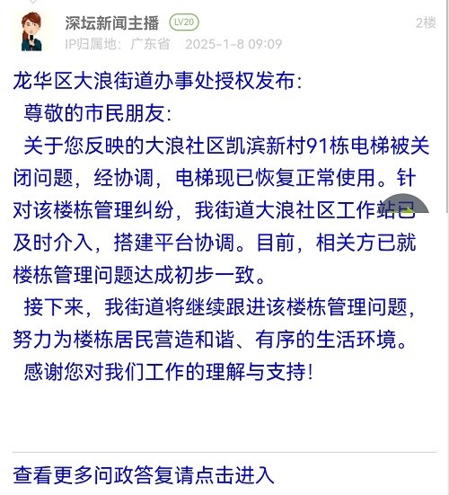 关于您反映的大浪社区凯滨新村91栋电梯被关闭问题,经协调,电梯现已恢复正常使用。针对该楼栋管理纠纷,我街道大浪社区工作站已及时介入,搭建平台协调。目前,相关方已就楼栋管理问题达成初步一致。