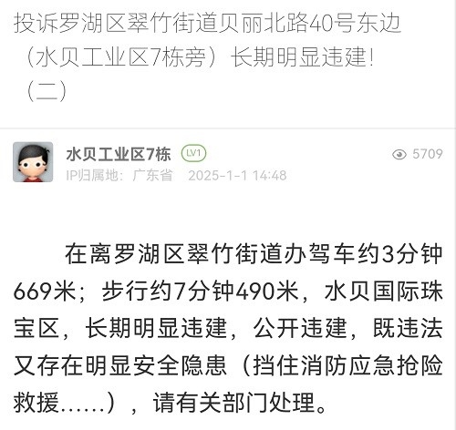14. 帖文《投诉罗湖区翠竹街道贝丽北路40号东边(水贝工业区7栋旁)长期明显违建!(二)》