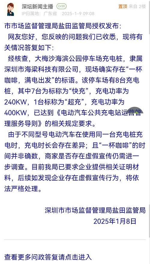由于不同型号电动汽车在使用同一台充电桩充电时,充电时长会存在差异;且“一杯咖啡”的时间并非确数,商家是否存在虚假宣传仍需进一步调查。目前我局已要求企业提供相关证明材料,后续如发现企业存在虚假宣传行为,将依法严格处理。