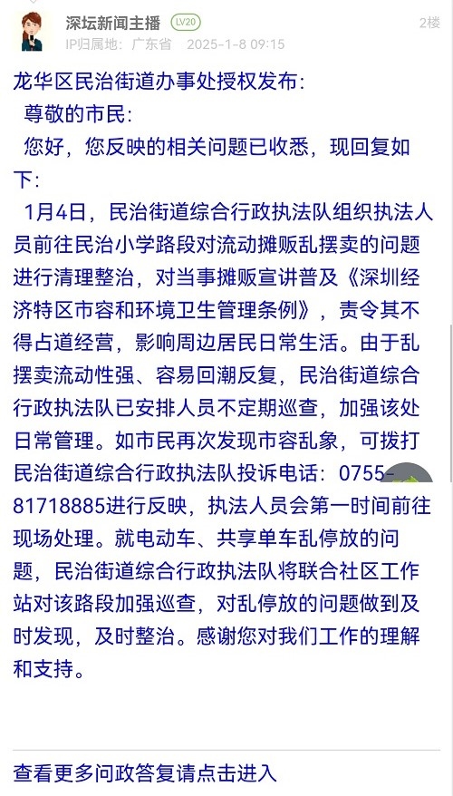 1月4日,民治街道综合行政执法队组织执法人员前往民治小学路段对流动摊贩乱摆卖的问题进行清理整治,对当事摊贩宣讲普及《深圳经济特区市容和环境卫生管理条例》,责令其不得占道经营,影响周边居民日常生活。由于乱摆卖流动性强、容易回潮反复,民治街道综合行政执法队已安排人员不定期巡查,加强该处日常管理。如市民再次发现市容乱象,可拨打民治街道综合行政执法队投诉电话:0755-81718885进行反映,执法人员会第一时间前往现场处理。就电动车、共享单车乱停放的问题,民治街道综合行政执法队将联合社区工作站对该路段加强巡查,对乱停放的问题做到及时发现,及时整治。感谢您对我们工作的理解和支持。