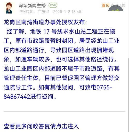 经了解,地铁 17 号线求水山站工程正在施工,原有市政路段暂时封闭。居民经龙山工业区内部道路通行,导致园区道路出现拥堵现象,如遇车辆较多,也可选择其他路径绕行。龙山工业园区内部道路不属于市政道路,有其管理责任主体,目前已督促园区管理方做好交通疏导工作。如有其他疑问,可致电0755-84867442进行咨询。