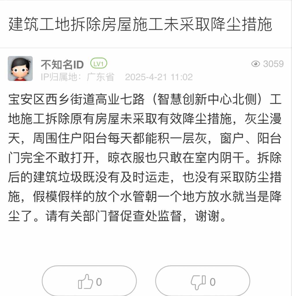 1. 帖文《建筑工地拆除房屋施工未采取降尘措施》