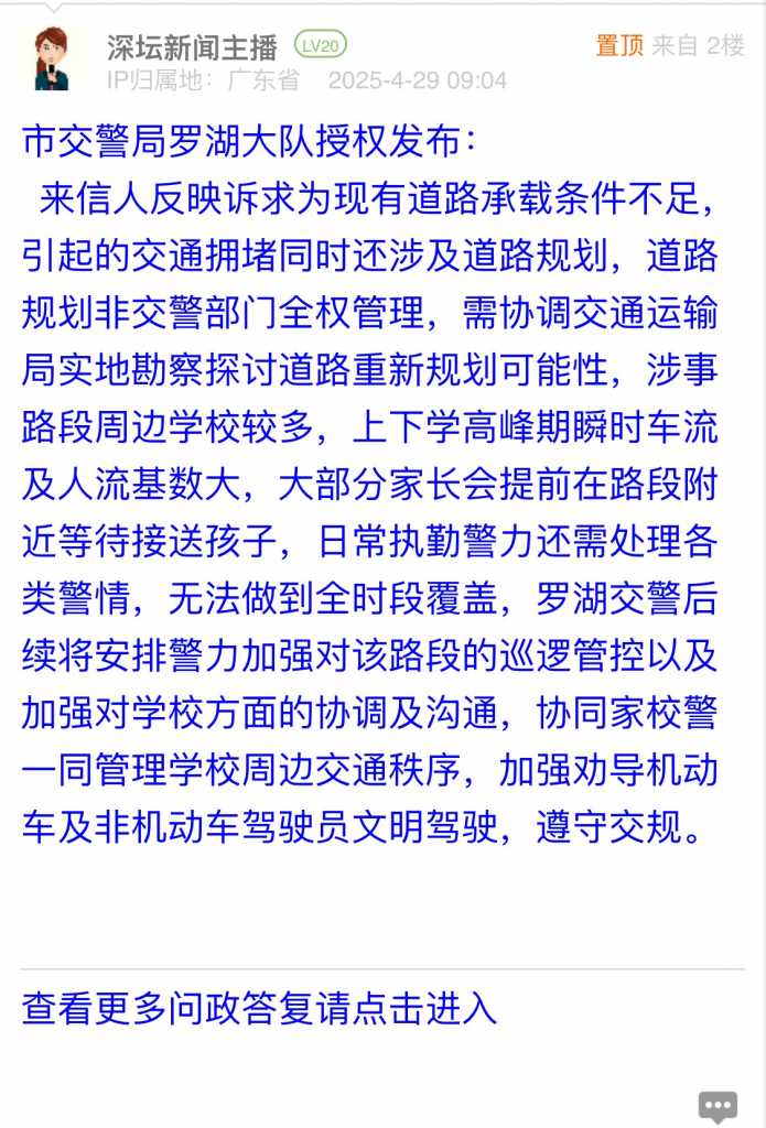 来信人反映诉求为现有道路承载条件不足,引起的交通拥堵同时还涉及道路规划,道路规划非交警部门全权管理,需协调交通运输局实地勘察探讨道路重新规划可能性,涉事路段周边学校较多,上下学高峰期瞬时车流及人流基数大,大部分家长会提前在路段附近等待接送孩子,日常执勤警力还需处理各类警情,无法做到全时段覆盖,罗湖交警后续将安排警力加强对该路段的巡逻管控以及加强对学校方面的协调及沟通,协同家校警一同管理学校周边交通秩序,加强劝导机动车及非机动车驾驶员文明驾驶,遵守交规。