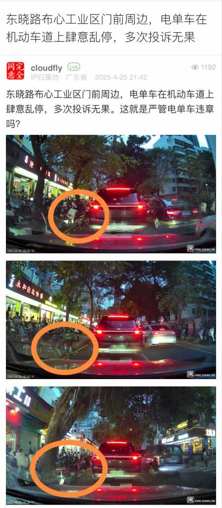12. 帖文《东晓路布心工业区门前周边,电单车在机动车道上肆意乱停,多次投诉无果》